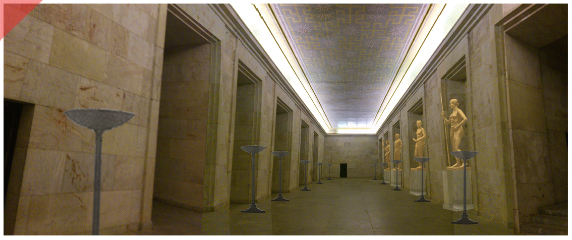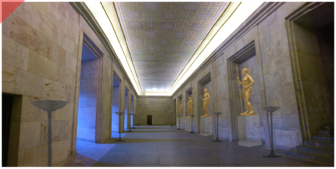 Für den „Goldenen Saal“ war laut Quellenlage auch das Aufstellen der vergoldeten Skulptur „Sieg der Arbeit“ vorgesehen (zum „Reichsparteitag“ 1939). Der Platz hierfür ist historisch nicht gesichert. Aus uns Sicht ist optisch nur die Front zu den Eingangstoren denkbar.