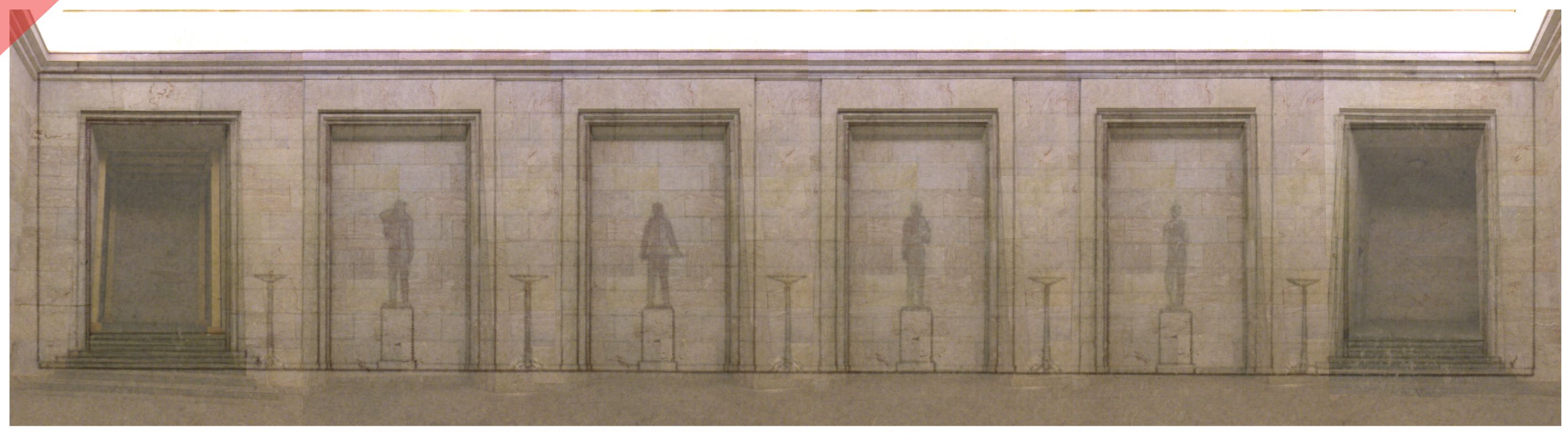 In einer Überblendung zeigen wir die Nischenfront des „Goldenen Saals“ (Stand: Juli 2017) mit den geplanten Figuren (Höhe und Breite, Form des Sockels). Die Schwarz-Weiß-Bildquelle mit diesen Informationen stammt aus dem Jahre 1936.