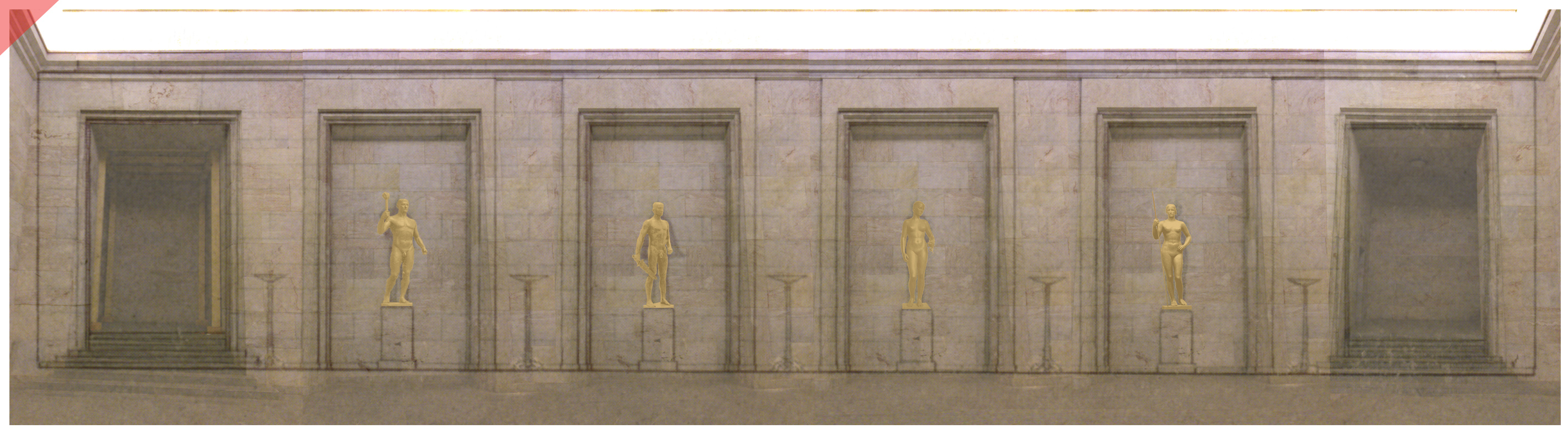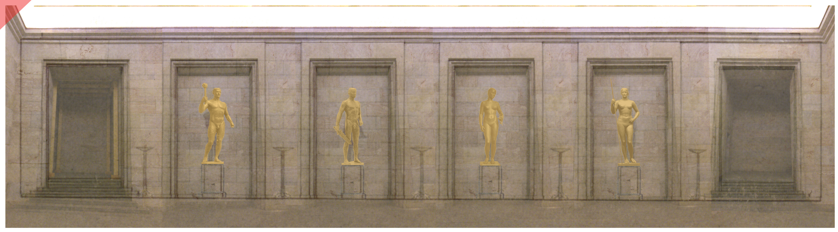 Es kann daher nicht ausgeschlossen werden, dass die Figuren im „Goldenen Saal“ diese Größe bekommen hätten. Unsere Basis-Datengrundlage stammt aus dem Jahre 1936. Die Figuren waren für den September 1939 vorgesehen. Es wäre mit das erste Mal gewesen, wenn sich an den ursprünglichen Planungen nichts mehr geändert hätte. Letztlich wurde alles einen Tick größer. Wir möchten diese Möglichkeit nicht unterschlagen. Der Platz in den Raumnischen hätte gereicht.